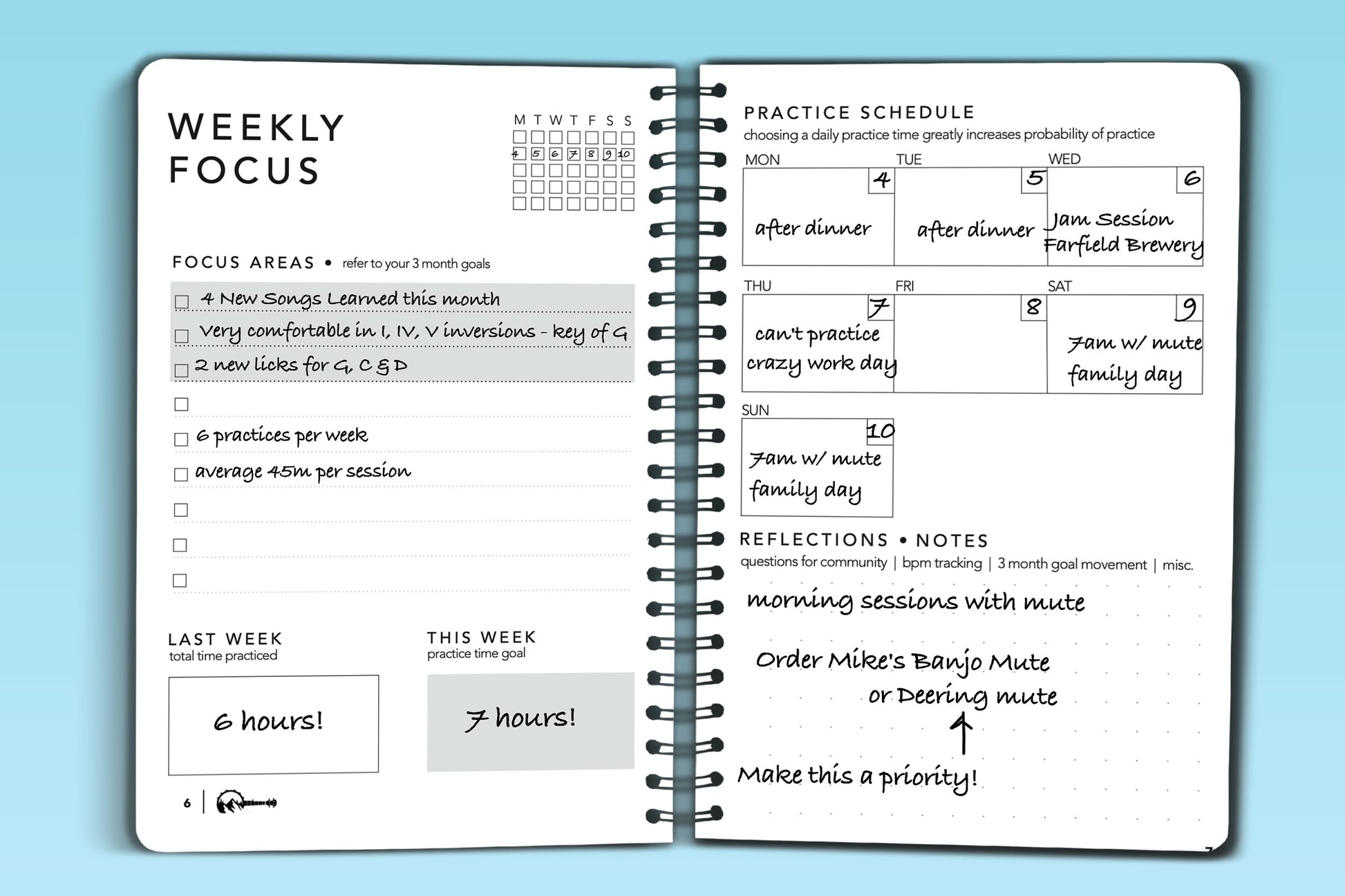 Designed to work hand in hand with our Practice Toolkit course (2.5 hrs, 12 lessons), this Quarterly Practice Journal will skyrocket your practice routine to the next level. It's a 3-month Practice Journal with a top-down focus approach, including targeted 3-month and weekly goal pages combined with daily journal entries that will help you stay consistent in your practice and practice longer. 201 pages. 60# beautiful white pages.